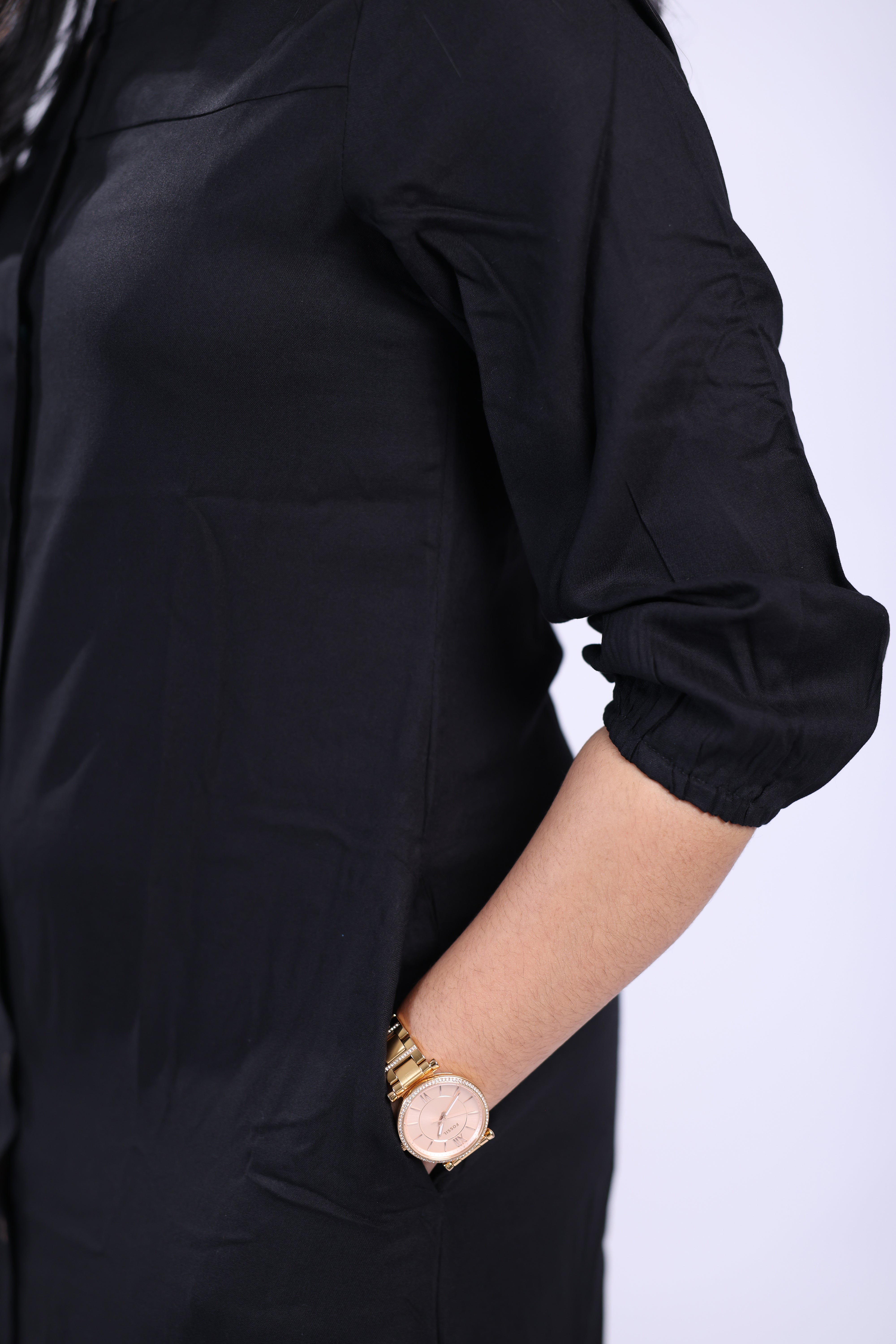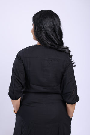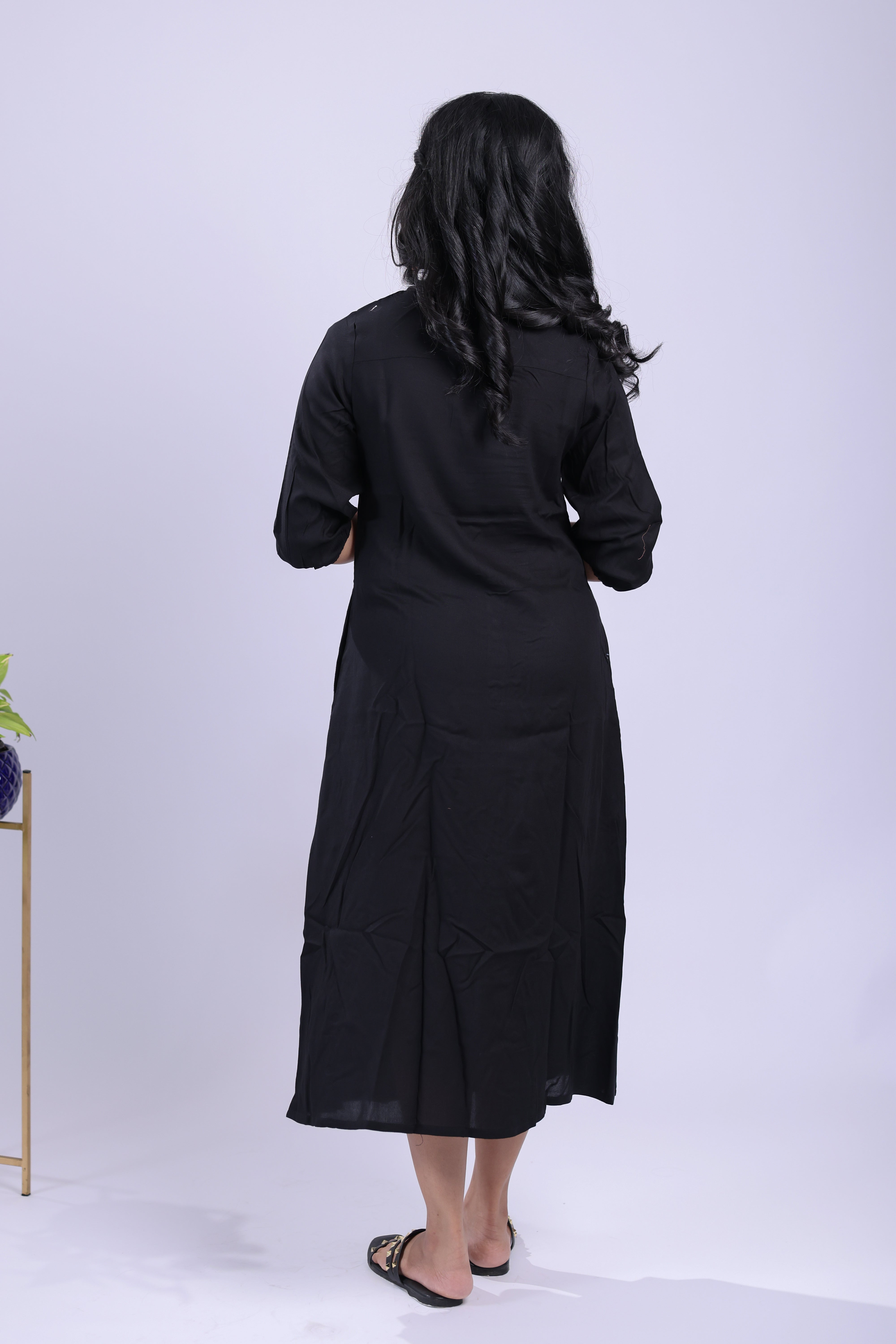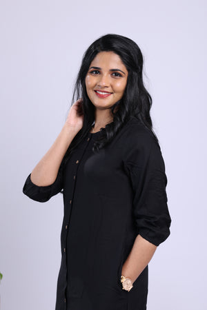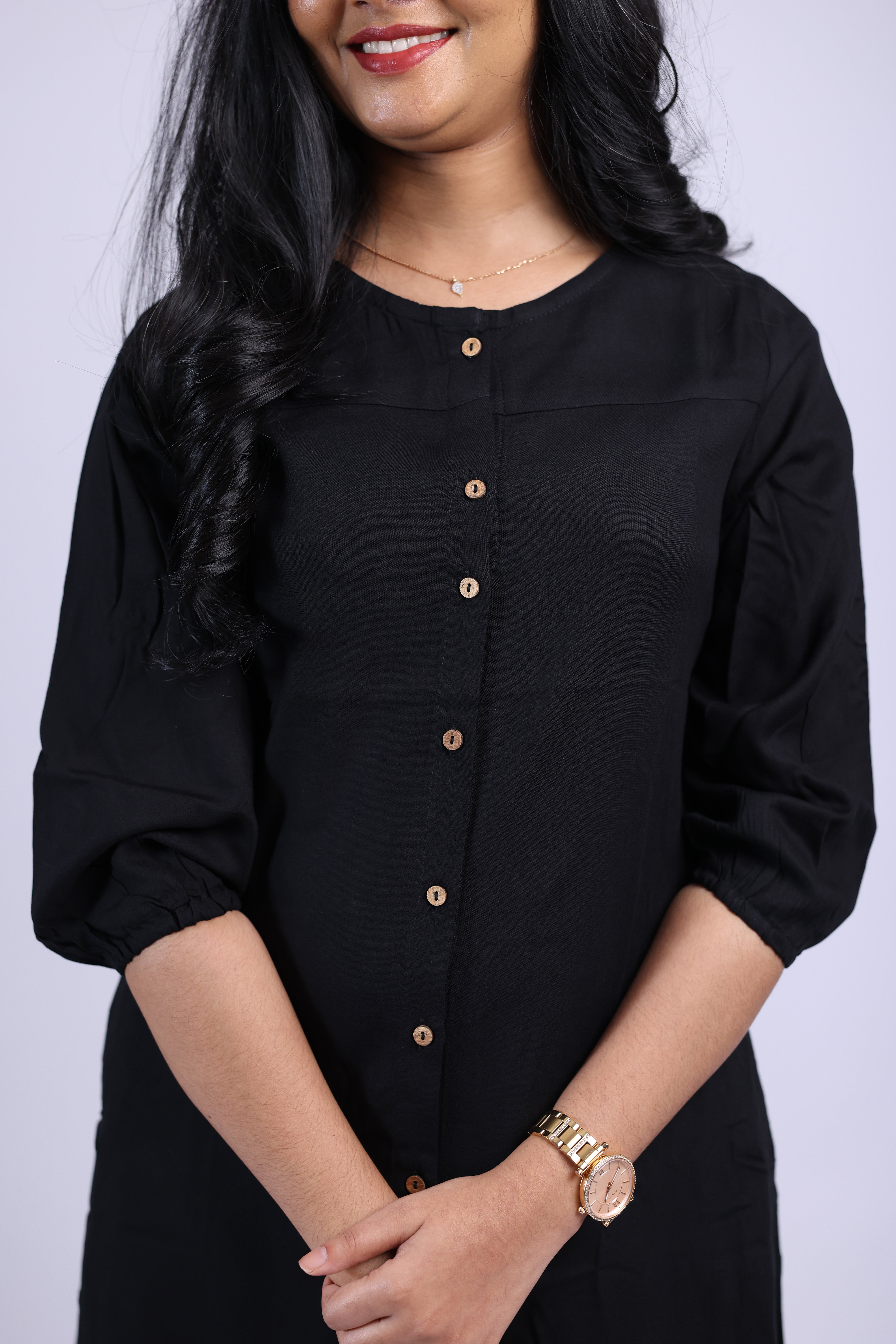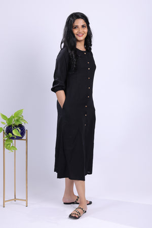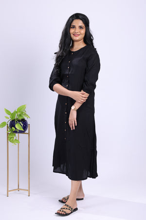Make a bold statement with this Solid Black A-Line Rayon Dress, perfect for minimalists who love a touch of drama. The soft silhouette and button-down detail make it a go-to for both casual and semi-formal looks.