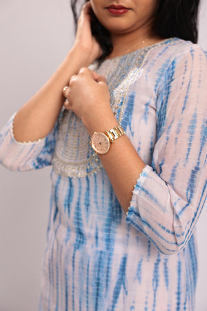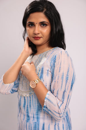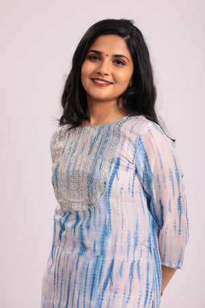 Turn heads with this serene sky blue kurta set featuring elegant mirror work and embroidery at the neckline. Crafted in a breathable cotton blend, it brings a relaxed yet festive vibe — perfect for brunches, casual outings, or festive get-togethers.
