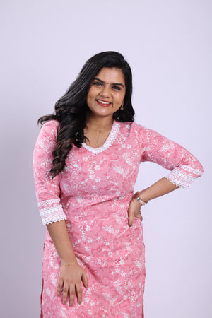 Elegant, breezy, and perfect for everyday wear — this Pink Floral Cotton Kurta Set is designed for both comfort and style. Crafted from soft, breathable 100% cotton, the kurta features a delicate white floral print on a soothing pink base, accented with lace trim along the V-neckline and sleeve hems for a touch of femininity.