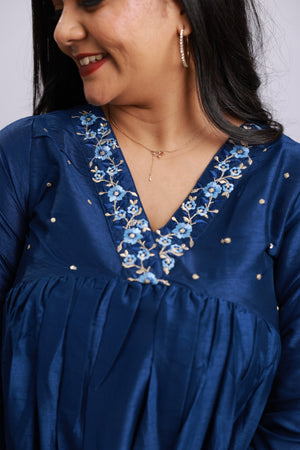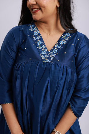 Turn heads in this midnight blue beauty, tailored in a luxe silk blend with delicate floral embroidery. The pleated flare adds flow and femininity – perfect for special brunches, festive evenings, or just when you want to feel extra