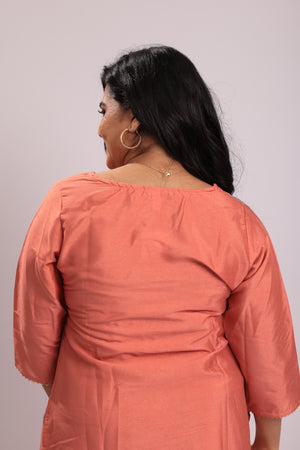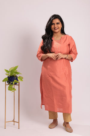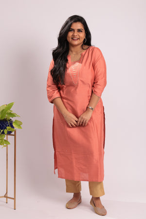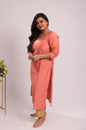 This peach-toned kurta is the definition of graceful minimalism. Crafted in a silk blend for that subtle sheen, it features delicate detailing at the neckline and sleeve edges – just enough to catch the light and attention