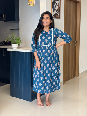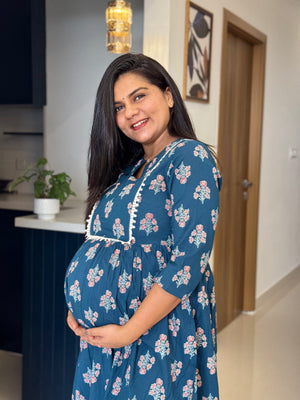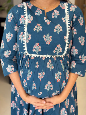 Expertly designed with comfort in mind, our Floral A line Kurti is the perfect choice for expecting mothers. The A line cut provides a flattering fit, while the knot detail adds a touch of style. Made with breathable fabric, this maternity wear offers a non-intrusive design with no feeding option.
